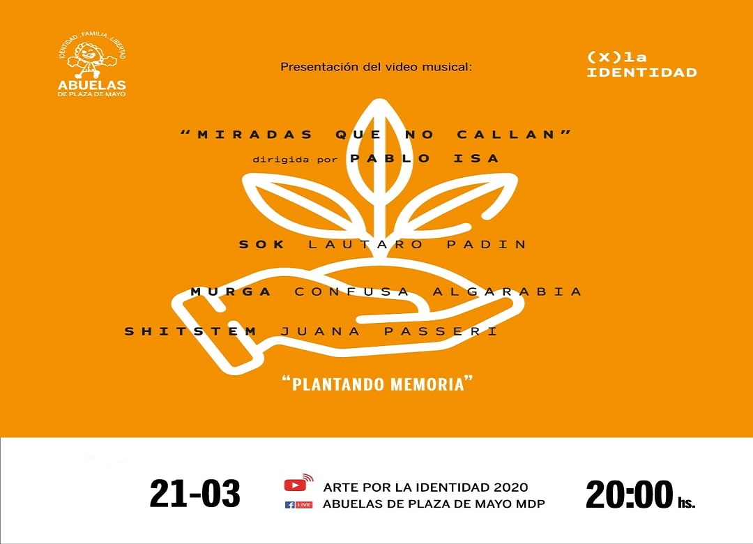 Abuelas de Plaza de Mayo filial Mar del Plata lxs invita al lanzamiento de la canción “Miradas que no callan”, el próximo domingo 21 de marzo a las 20hs. a través de YouTube y Facebook, junto a lxs artistas locales Juana Passeri SHITSTEM, Lautaro Padin SOK y la MURGA CONFUSA ALGARABÍA quienes contarán cómo fue el recorrido desde la gestación de la letra hasta la grabación en estudio y la filmación del videoclip.