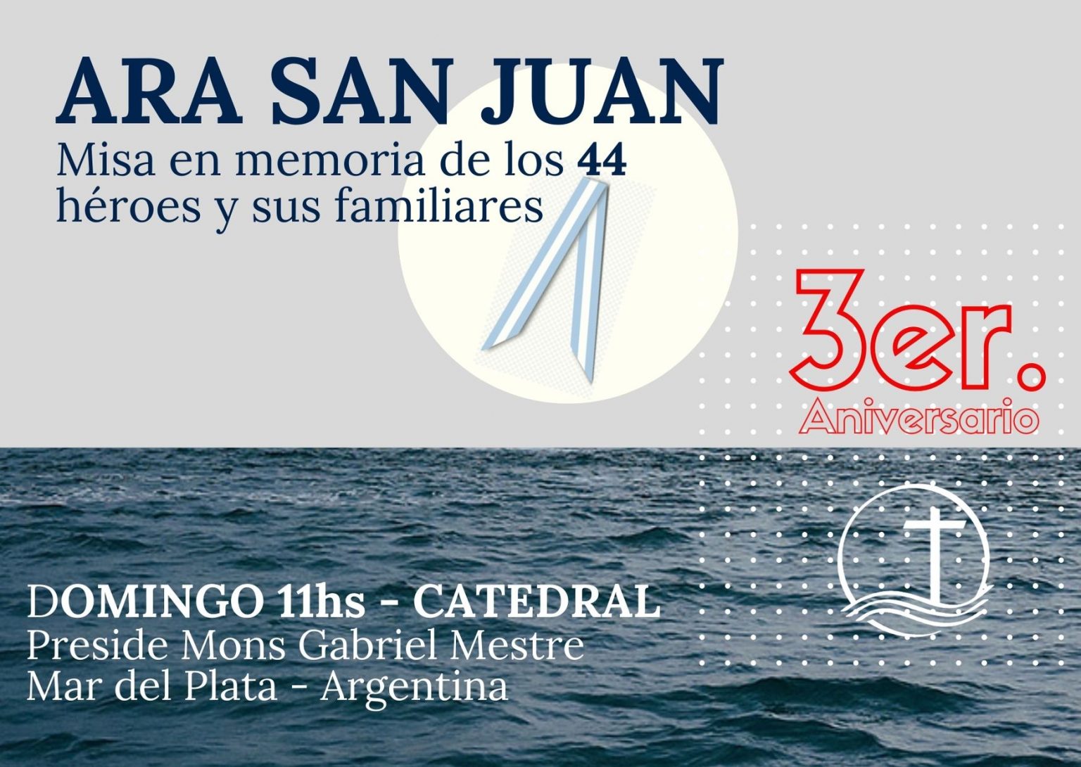 Por su parte, el próximo domingo a las 11hs en la Iglesia Catedral se celebrará una Misa presidida por el Obispo Gabriel Mestre que rezara por el 3er aniversario de la desaparición del Submarino ARA San Juan, por los 44 héroes que descansan en el mar y por sus familiares. Participación abierta y con estricto protocolo sanitario.