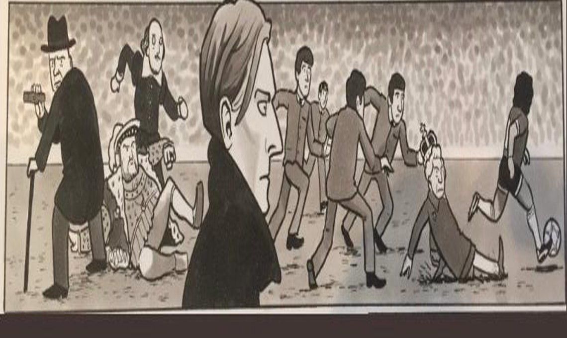 Squires bromeó: “Enrique VIII estuvo más cerca de él que Terry Fenwick, para ser justos”, por uno de los defensores ingleses que en vano intentó capturar a Maradona. Otras figuras que aparecen en la caricatura son: Winston Churchill, Enrique VIII, William Shakespeare y David Bowie.