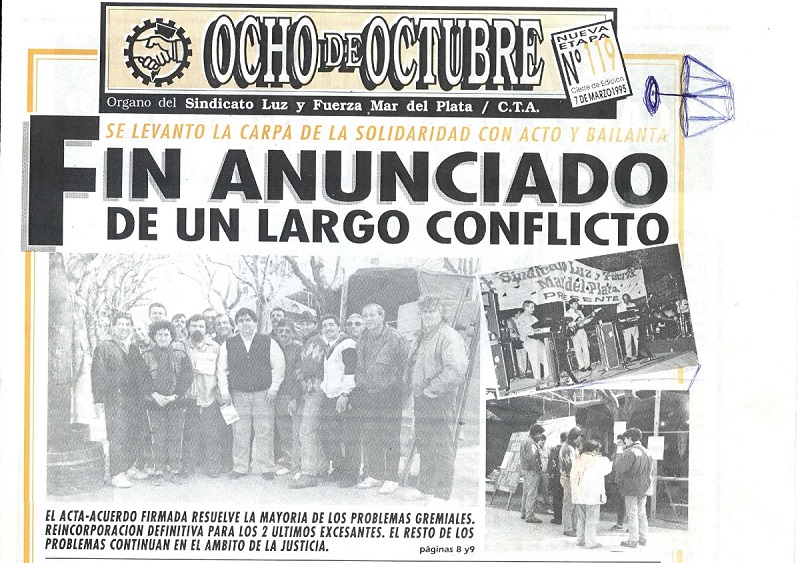 Ese día, después de 7 meses y 11 días, luego de firmar el acuerdo con la reincorporación de 23 trabajadores despedidos en mayo del año anterior, se levantó la carpa instalada frente a las oficinas de la entonces empresa provincial de Energía ESEBA S.A. en diagonal Pueyrredon y Belgrano.