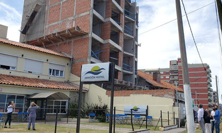 Durante el mediodía de ayer, en una obra ubicada en Aragón y Félix U. Camet, se desprendió un andamio donde se encontraban trabajando cinco obreros. A raíz del accidente, los obreros quedaron colgando de su arnés de seguridad a una altura de 10 metros.