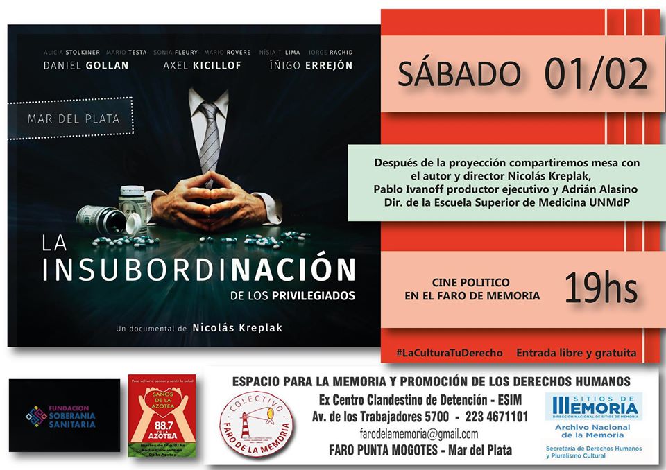El próximo sábado 1 de febrero a las 19 horas el Colectivo Faro de la Memoria les invita al Espacio para la Memoria y la Promoción de Derechos Humanos ex CCD ESIM a la proyección de la película documental «La insubordinación de los privilegiados». contaremos con la presencia de su autor y director Nicolás Kreplak, Médico Clínico. Sanitarista. Especialista en Economía Política para la Salud. Docente de la UBA y Universidad de José C. Paz. Presidente de la Fundación Soberanía Sanitaria, Ex Viceministro de Salud de la Nación.