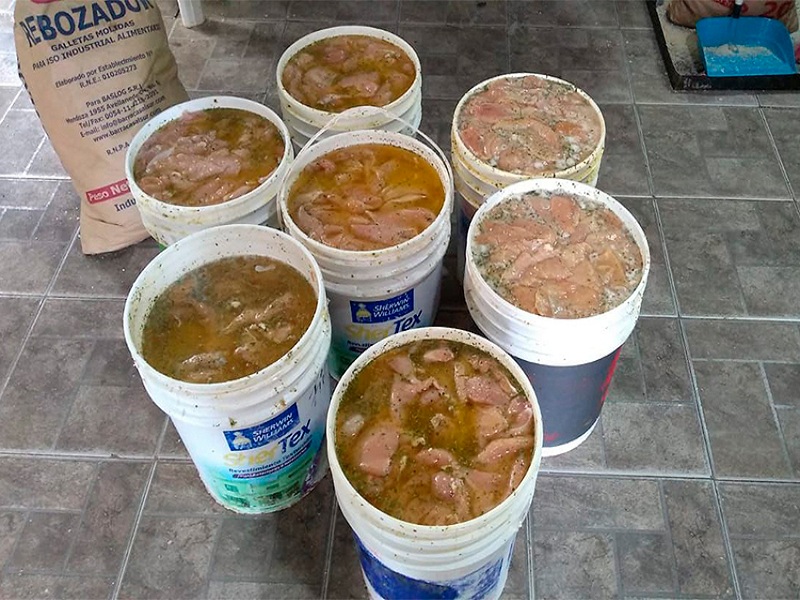 El personal de bromatología constató la falta de habilitación municipal para la producción y comercialización de los productos. Se secuestraron de 150 Kg pechugas de pollo con preparado de huevo y condimento para milanesas, distribuidos en 7 baldes de 20 ltrs c/u y 83 Kg milanesas de pollo preparadas para la venta.