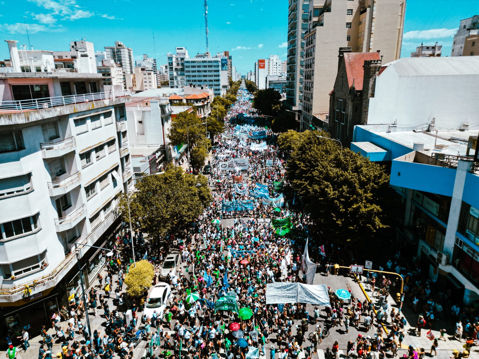 Ausencia total de nubes que pudieran mitigar los más de 30 grados que caracterizaron el día de verano en la ciudad. Bajo el rayo del sol, miles y miles de personas se dirigieron a los diversos puntos de encuentro signados en el centro y macrocentro marplatenses. Al mediodía, bancos, comercios, cafés y restaurantes comenzaron a bajar sus persianas en adhesión a la medida de fuerza. El desvío de recorridos habituales de colectivos estuvo a la orden del día para sortear el tumulto y permitir que se realizara la movilización.