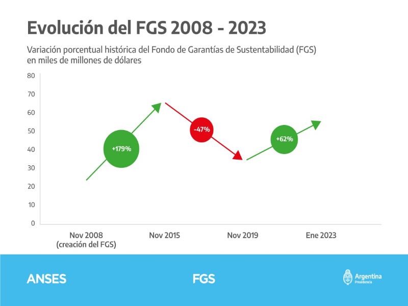 En noviembre 2008, año de su creación tras la recuperación de los fondos de las AFJP, el Fondo de Garantía de Sustentabilidad (FGS) tenía una valuación de 23.749 millones de dólares.