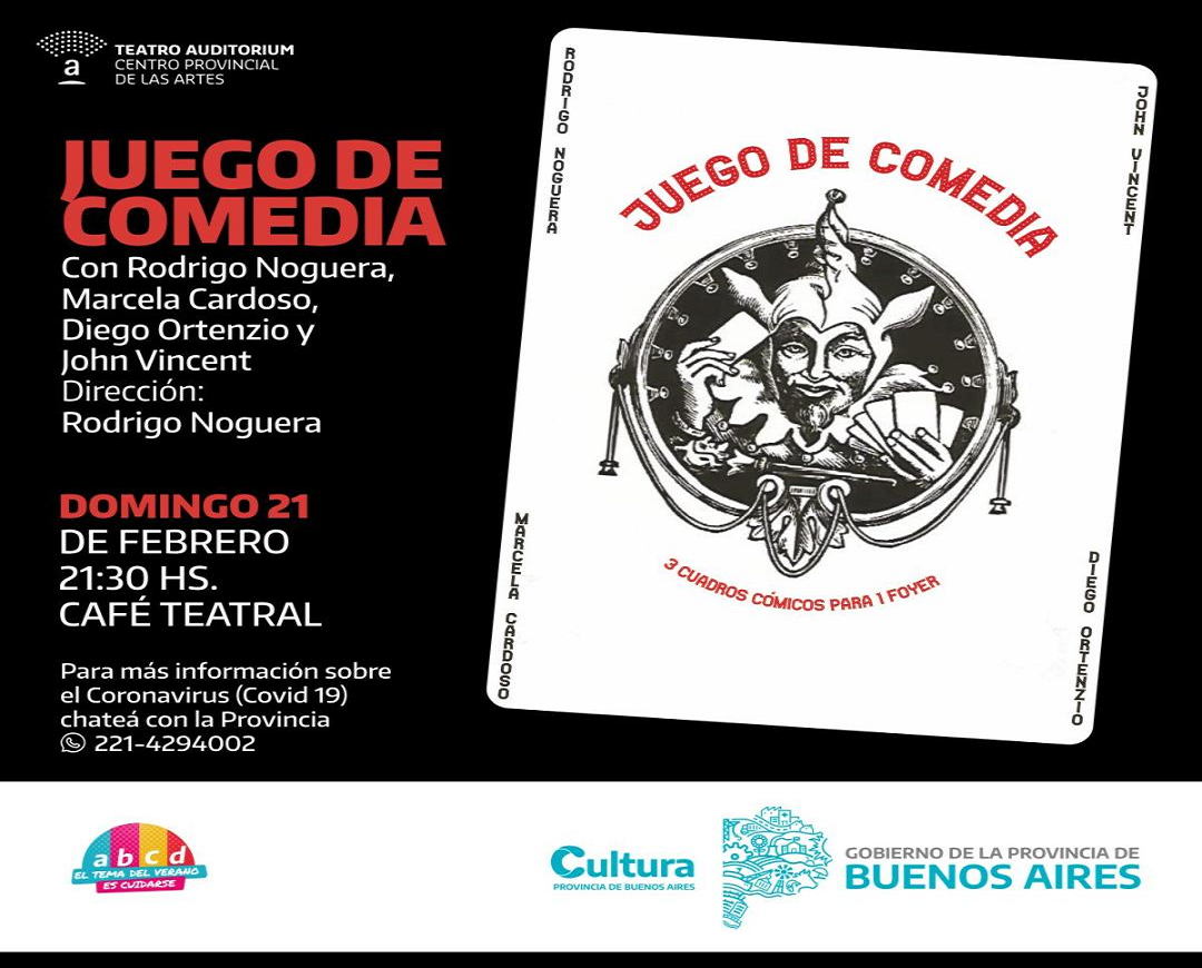 El Teatro Auditorium presenta la obra «Juego de Comedia», 3 cuadros cómicos para 1 Foyer, dirigida por Rodrigo Noguera. La función será el domingo 21de febrero a las 21.30 en el Café Teatral Emilio Alfaro.