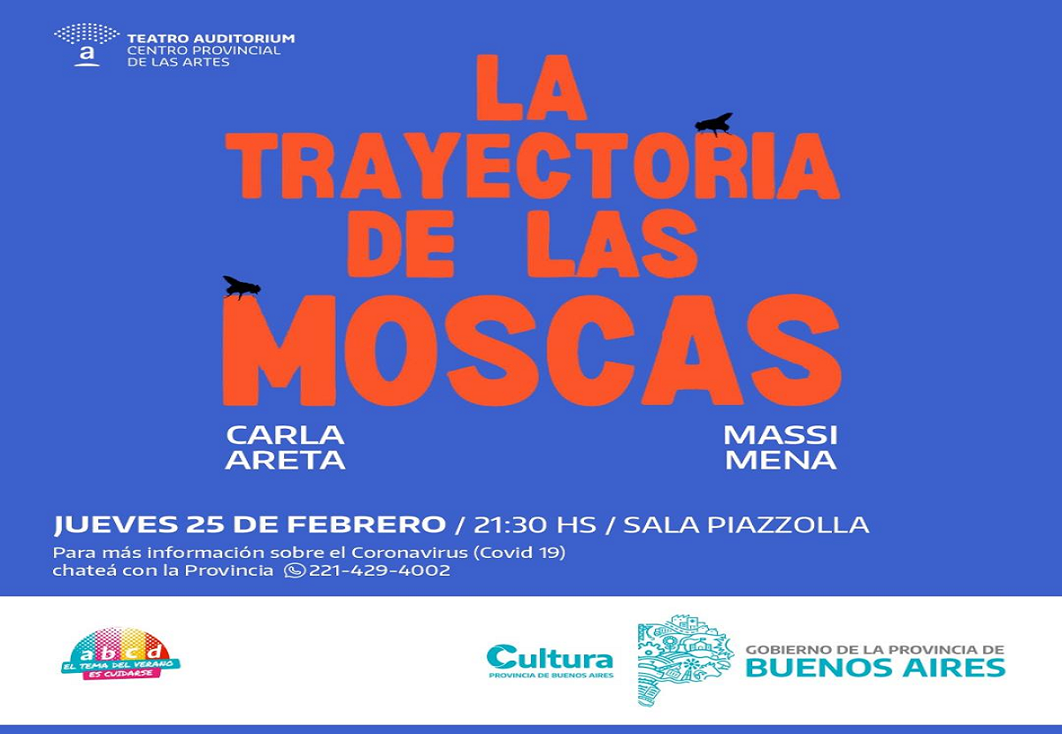 En esta oportunidad subirá a escena la obra “La trayectoria de las moscas” con actuación, dramaturgia y dirección de Carla Areta y Massimiliano Mena. La función será el jueves 25 de febrero a las 21.30 en la Sala Astor Piazzolla.