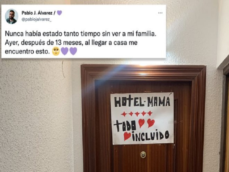 El ‘Hotel Mamá’ es ya casi tan mítico como el ‘Hotel California’. Pablo J. Álvarez, un diseñador gráfico asturiano que llevaba 13 meses sin ver a su familia, se encontró un genial cartel en la puerta del piso de sus padres. Tanto, que el tuit se hizo inmensamente viral en pocas horas.