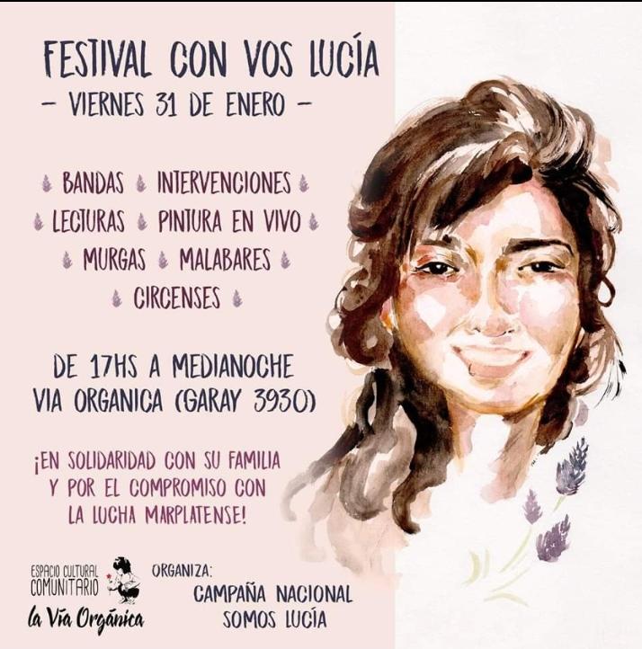 Este 31 de enero, en Vía Orgánica (Garay 3930) se llevará a cabo el festival «Con vos Lucía», a partir de las 17 hasta la medianoche, con el fin de «solidarizarse con su familia y por el compromiso de la lucha marplatense». En él, habrá bandas, intervenciones artísticas, lecturas, pintura en vivo, murgas, malabares y circenses.