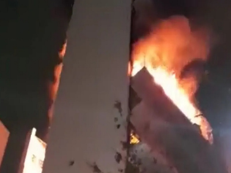 Los bomberos intentan acceder con escaleras a los pisos más altos para rescatar a las y los vecinos. Una explosión podría haber sido la causa del incendio.