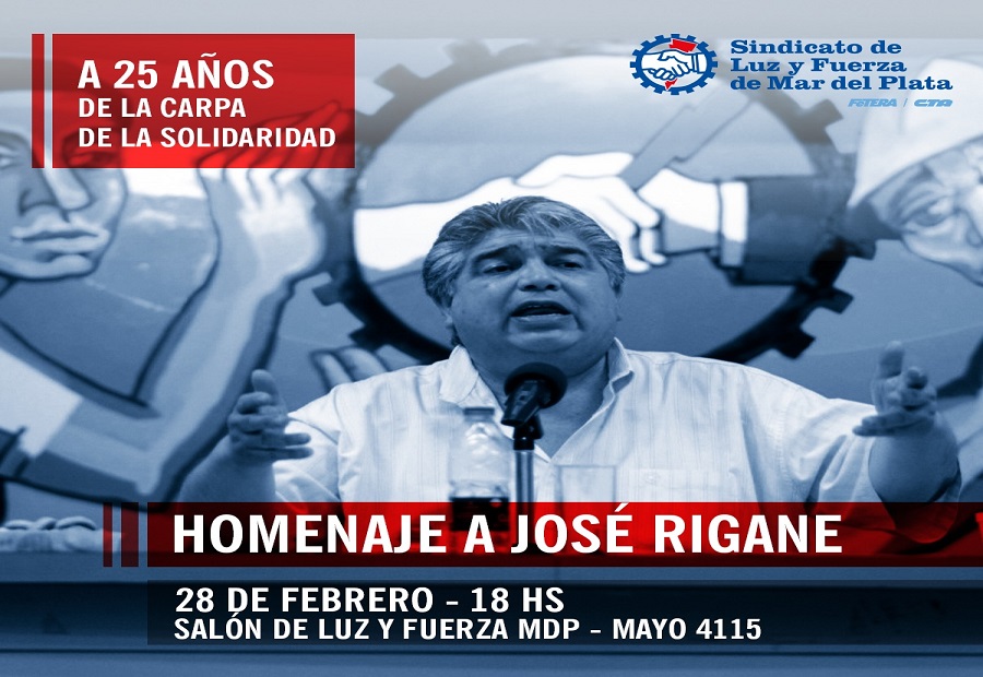 El Sindicato de Luz y Fuerza de Mar del Plata invita a la comunidad a participar este viernes 28 de febrero del Acto público Homenaje a José Rigane y a 25 años de la Carpa de la Solidaridad. El encuentro se realizará en la sede del gremio, 25 de Mayo 4115 a las 18hs.
