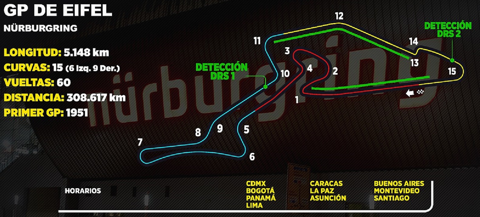 La F1 vuelve a las actividades este fin de semana para el debutante GP de Eifel, el cual se llevará a cabo en el legendario circuito de Nürburgring, te presentamos los horarios para Latinoamérica y no te pierdas detalle de la Fórmula 1.