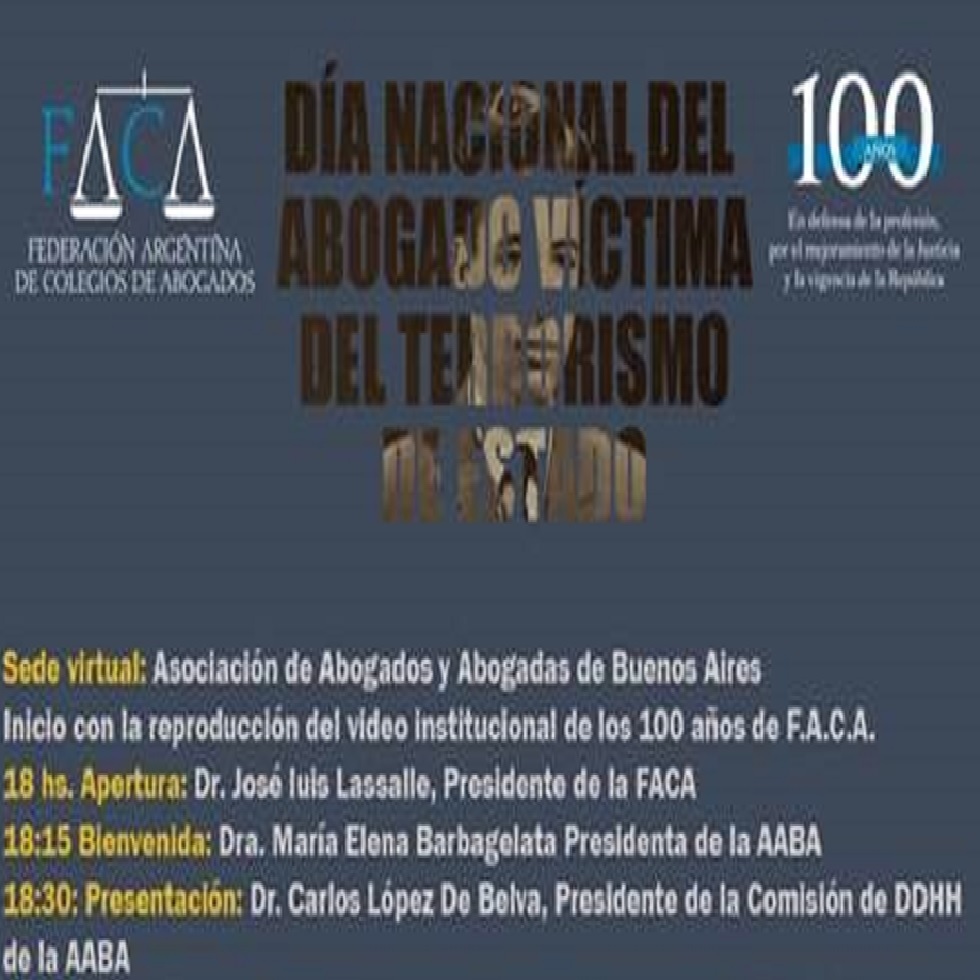 El Consejo Directivo del Colegio de Abogados de Mar del Plata que preside el doctor Fabián Gerardo Portillo invita a participar del acto virtual que se realizará este martes en conmemoración del Día Nacional del Abogado víctima del terrorismo de Estado.
