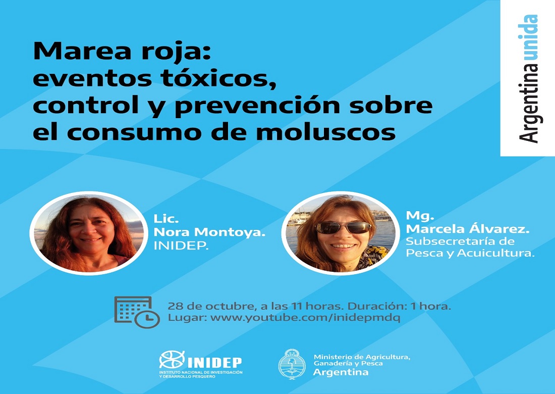 “Marea roja: eventos tóxicos, control y prevención en el consumo de moluscos” es el nombre del segundo webinar gratuito y abierto al público, del nuevo ciclo organizado por el Instituto Nacional de Investigación y Desarrollo Pesquero, que vincula a sus investigadores y técnicos con colegas de otras instituciones públicas y también con profesionales del sector privado, dando mayor amplitud a las temáticas a abordar.