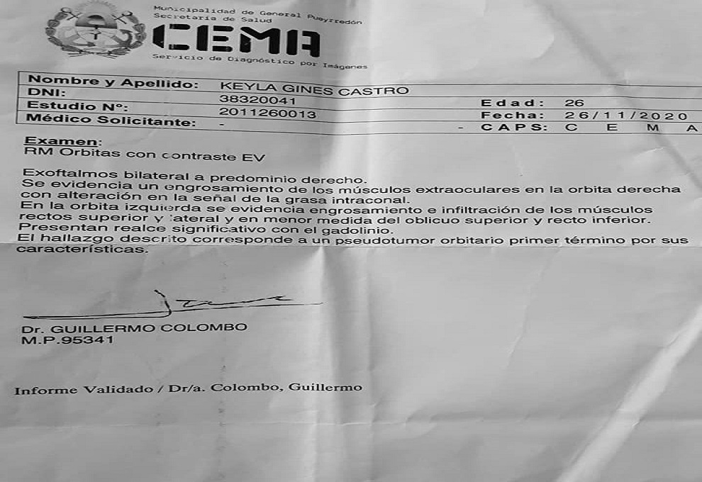 Cuando tenia 6 años me descubrieron una enfermedad rara con los síntomas de un (hemangioma epiteliode oseo) lo raro en mi caso es el lugar donde esta alojado, ya que acá en argentina no se conocen casos como el mio, estaba alojado detrás del globo ocular derecho.. pasaron los años y con tratamientos y operaciones lograron detener el crecimiento, tratamientos e intervenciones que me hacían en el Htal Garraham en la ciudad de bs.as, pasaron unos años mas y un día tuve un bebé, ahí pararon los tratamientos porque eran muy fuertes para el bebé y solo me controlaban en el Materno infantil (mdp).