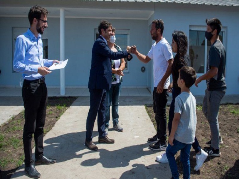 El gobernador de la provincia de Buenos Aires, Axel Kicillof, encabezó este lunes el acto de entrega de 24 viviendas en el barrio Virgen de Luján del municipio de General Pueyrredón. Fue junto al administrador general del Instituto de la Vivienda, Agustín Simone, y la secretaria del Consejo de Administración de la Cooperativa de Vivienda Raíces, Gabriela Martínez.