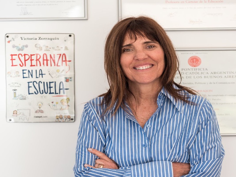 Victoria Zorraquín es licenciada, profesora y especialista en Educación. Fundadora de la ONG Educere: “Docentes por un Mañana”. Hace más de 25 años que Victoria se dedica a hablar acerca de la necesidad de recuperar el prestigio docente. Ha recorrido escuelas de todo tipo y condición en la Argentina y en el mundo. Estuvo al frente de la Dirección de Escuelas Secundarias, Agrarias y Rurales, que depende del Ministerio de Agroindustria de la Nación. Durante 2019, ocupó el cargo de directora de Formación Continua en la Provincia de Buenos Aires.
