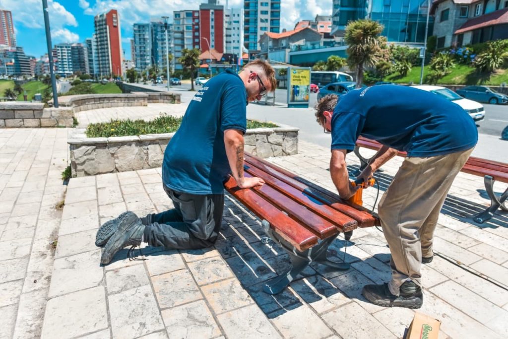 Además de las mejoras en mobiliario urbano, el EMSUR puso especial atención en la restauración de bancos de madera, recuperados en talleres municipales con tareas de limpieza, lijado, pintura y barnizado.