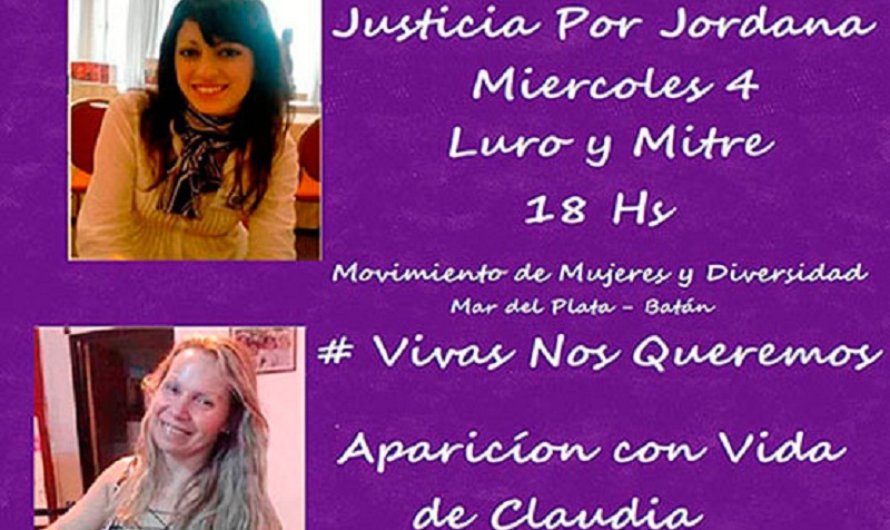 El Movimiento de Mujeres y Diversidad de Mar del Plata convocó a marchar hoy a las 18 en Luro y Mitre por el femicidio de Jordana Belén Rivero. También exigirán la aparición con vida de Claudia Repetto, la mujer desaparecida desde el domingo pasado.