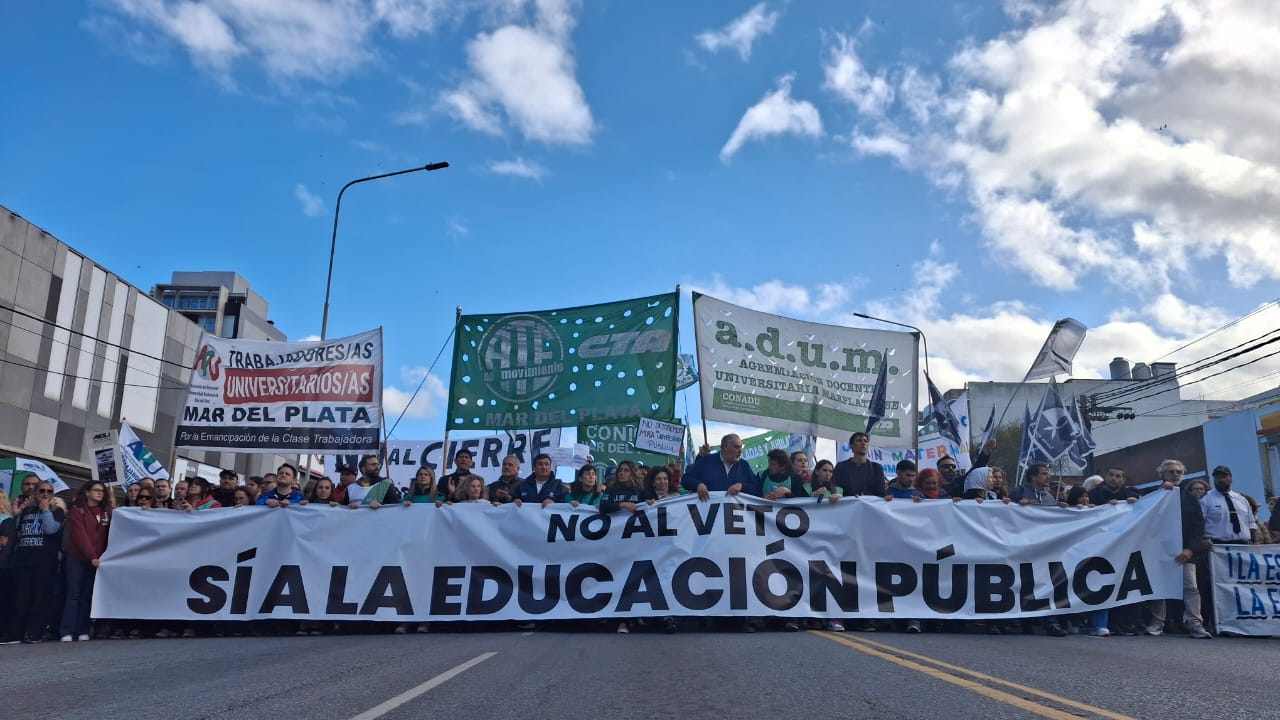 Una extensa columna de docentes, no docentes, estudiantes, graduados/as, jubilados/as y miembros de la sociedad se congregó este miércoles por la tardes desde el complejo universitario de Mar del Plata hasta el centro de la ciudad en repudio al recorte presupuestario del gobierno de Javier Milei a la educación pública superior.