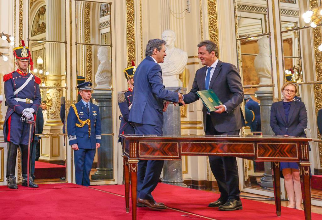 El ministro de Economía, Sergio Massa, y el ministro de Hacienda de Brasil, Fernando Haddad, dieron el primer paso para avanzar en un aumento del comercio bilateral, avanzar en el objetivo de una moneda común, el desarrollo de la integración energética y en un programa de financiamiento de exportaciones recíproco, en el marco de la visita del flamante presidente brasileño Luiz Inacio Da Silva.
