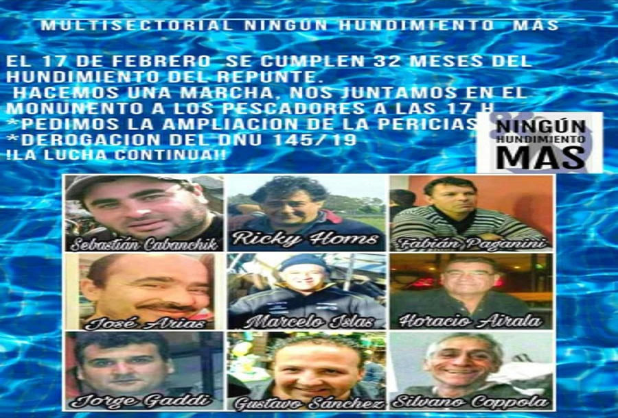 Este lunes 17 de febrero, se cumplen 32 meses del hundimiento del Repunte, y los familiares de las victimas se juntarán nuevamente en el Monumento a los Pescadores a las 17. Volverán a reclamar la ampliación de las pericias y la derogación del DNU 145/19, bajo el lema de #NingunHundimientoMas.