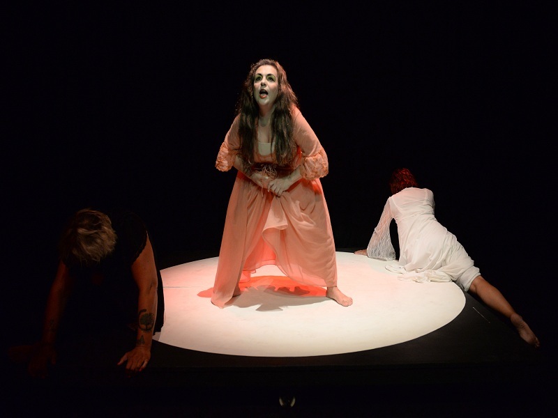 Las actrices -más que construir personajes- ejecutan el texto en la polifonía de las corporalidades conmovidas. Lo sufren. Lo lloran. Un único dispositivo móvil dinamiza la escena y genera aún más la sensación de un frágil equilibrio, aunque el desequilibrio representa la muerte. “Me muero por vos”, dice en uno de sus primeros párrafos, y lo más atrevido es la indagación sobre un juego erótico que atrapó a la víctima en el sinsentido del circulo violento. Me muero por vos: por tu amor y por tu culpa me muero. Aun en vida.