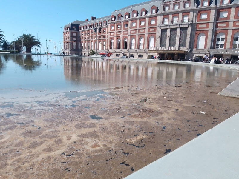 Luego de estacionar el auto, pasé por la plaza contigua, donde está la fuente de aguas danzantes. Recordé que hacía bastante tiempo que no veía los chorros de agua surcando la noche al son de la música, un atractivo más para los turistas que disfrutan meterse dentro de la histórica y eterna postal de la ciudad más visitada de la Argentina. Pero el agua en completo reposo lucía putrefacta, con bichos y basura que no dejaban espejar en su reflejo al edificio que diseñara el arquitecto Bustillo hace casi un siglo atrás. Y tomé la foto que acompaña esta nota.