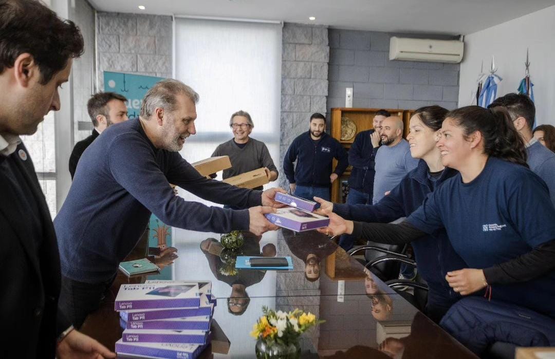 El subsecretario de Asuntos Portuarios, Juan Cruz Lucero, y el director de la Unidad Ejecutora Proyecto Vuce, Rodrigo Puértolas, recorrieron la terminal marplatense. Entregaron notebooks y tablets para el Consorcio Portuario Regional Mar del Plata.