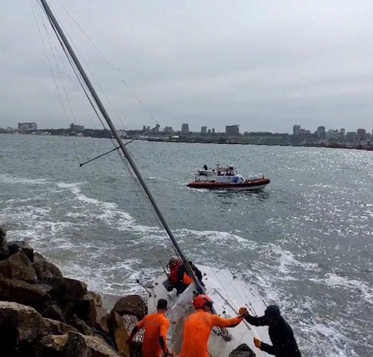 Efectivos de la Prefectura Naval Argentina (PNA) rescataron a tres tripulantes de un velero que había encallado en la escollera sur del puerto de Mar del Plata, informaron fuentes de ese organismo.