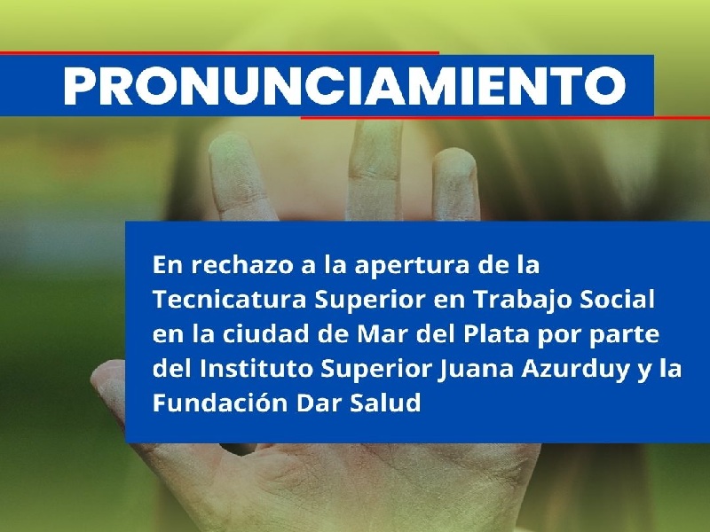 Nota realizada por el Colegio de Trabajadoras y Trabajadores Sociales del Distrito Mar del Plata, el Colegio de Trabajadoras y Trabajadores Sociales de la Provincia de Buenos Aires y la carrera de Trabajo Social de la Facultad de Ciencias de la Salud y Trabajo Social de la UNMDP. Expresamos nuestra preocupación y nos mantenemos en alerta ante la apertura de la Tecnicatura Superior en Trabajo Social (modalidad semi presencial) por parte del Instituto Superior Juana Azurduy y la Fundación Dar Salud en la ciudad de Mar del Plata.
