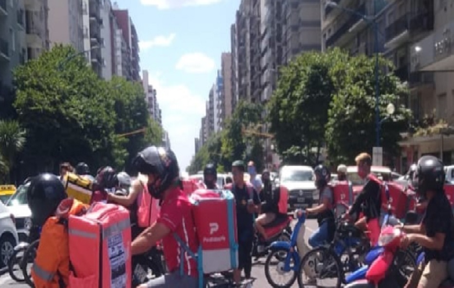 Repartidores de las aplicaciones Pedidos Ya y Rappi realizaron un paro y movilización este miércoles desde el mediodía en el centro de la ciudad.