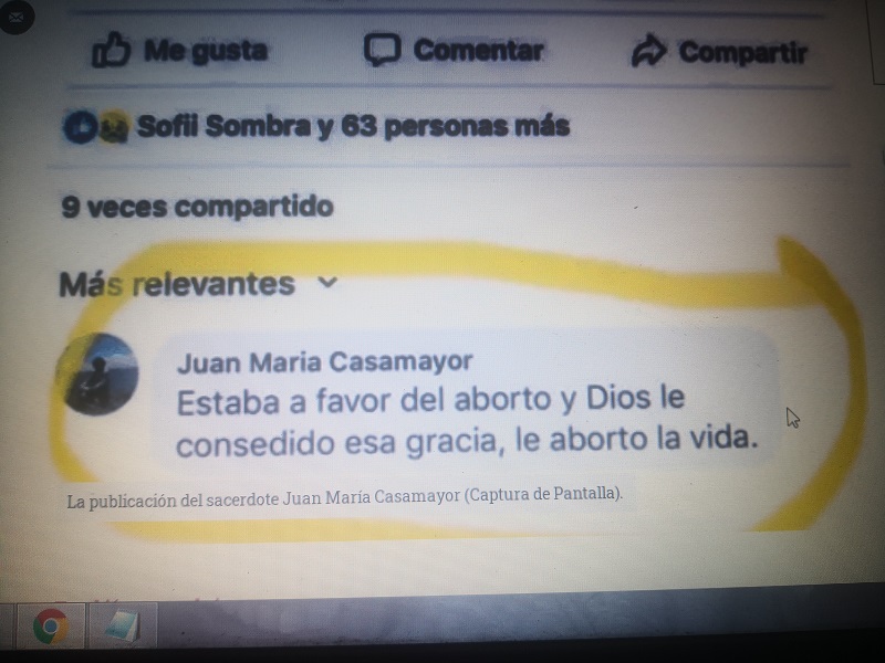 En el comentario publicado el sacerdote comete además un error ortográfico al escribir la palabra concedido con «s», «consedido» es lo que publica.