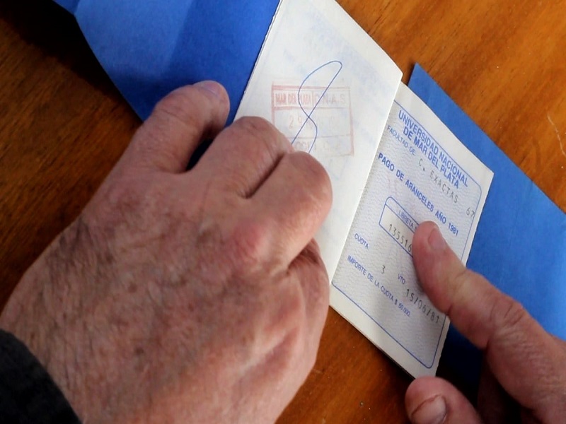 Un talonario con tapas azules y tres comprobantes: uno para el banco, otro para la Universidad y otro para la persona que pagaba por estudiar en la Unmdp. Del cajón de los recuerdos, Pedro Sanllorenti, el secretario general de Adum, recuperó un documento que dialoga con el presente, más concretamente, con las consecuencias de esos discursos que pretenden privatizar la educación superior.