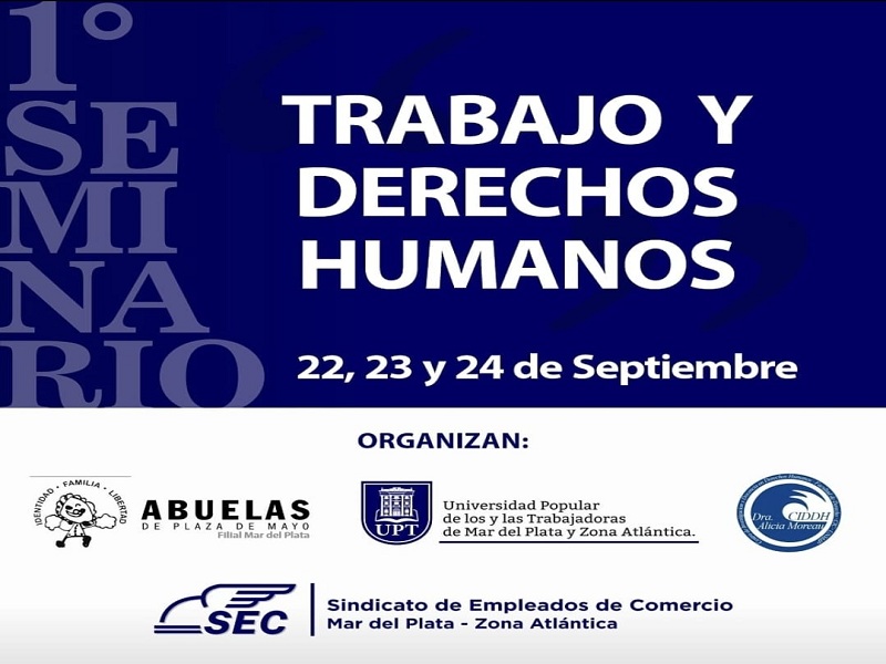 A partir del próximo miércoles 22 de septiembre se realizará la primera edición del Seminario de “Trabajo y Derechos Humanos”, organizado en forma conjunta por el Sindicato Empleados de Comercio Mar del Plata y Zona Atlántica, la Universidad Popular de los/as trabajadores/as (UPT), la Asociación de Abuelas de Plaza de Mayo filial Mar del Plata, y el Centro de Investigación y Docencia en Derechos Humanos Dra. Alicia Moreau (Facultad de Derecho/CIC).