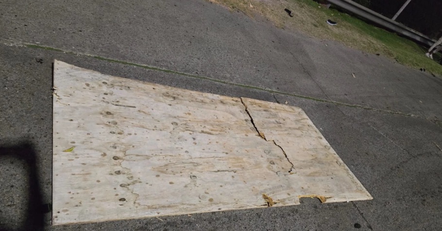 Policía Científica trabajó en el lugar para determinar cómo fue que se desprendió esa placa de fenólico de una obra de un edificio de varios pisos, que está en construcción, en medio del inicio de la fuerte tormenta de anoche.