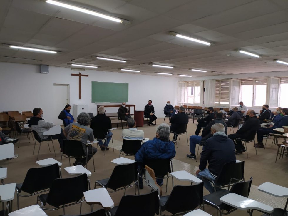 El obispo Gabriel Mestre recibió, en audiencia, a los referentes sindicales de la ciudad que habían solicitado una audiencia representando a las 62 organizaciones gremiales peronistas y la mesa multisectorial. La reunión se llevó a cabo con estricto cumplimiento de los protocolos sanitarios en un aula grande la Escuela Universitaria de Teología del obispado.