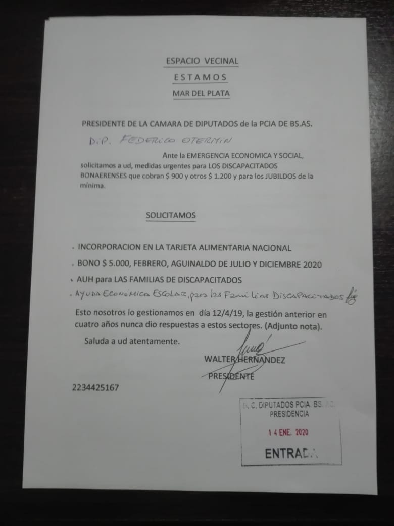 Desde el espacio vecinal Estamos en Mar del Plata, presentaron una carta a la Cámara de Senadores de la provincia de Buenos Aires, donde, además, «bono de 5 mil pesos, aguinaldo de julio y diciembre 2020, Asignación Universal por Hijo y ayuda escolar para las familias de discapacitados».