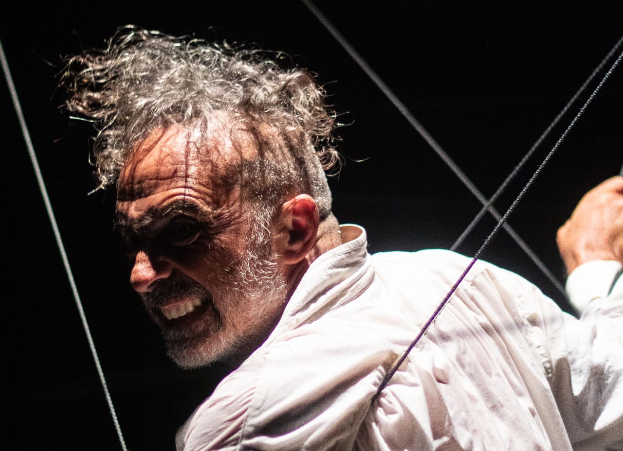 Fabián Canale hace uso de una condición propia ineludible: tiene un “decir” armónico y bello, entona con musicalidad y consigue una dicción que permite sostener un texto críptico sin perder la atención de un público que, reducidísimo por elección de la puesta, rodea el dispositivo escénico que es el eje de la experiencia. Es un performer que se mantiene en situación de exposición durante todo el tiempo que dura el espectáculo, que podría ser este u otro.