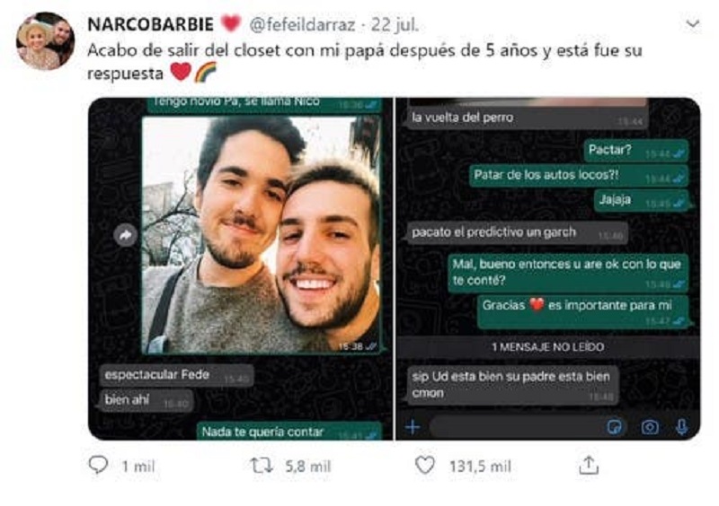 Padre e hijo hablaban por WhatsApp como todos los días, cuando el joven decidió mandarle una foto junto a su novio. Hacía un tiempo quería charlar con Ricardo sobre su vida amorosa y su orientación sexual y cuando lo hizo, su padre reaccionó de manera simple y amorosa. Cuando le dijo: «Tengo novio pa, se llama Nico», la respuesta fue: «Espectacular Fede, bien ahí».