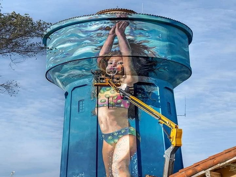 La obra fue seleccionada por la prestigiosa plataforma Street Art Cities. Se trata de una imagen de 35 metros de altura de dos niños sumergiéndose en el agua, su autor es Martín Ron.