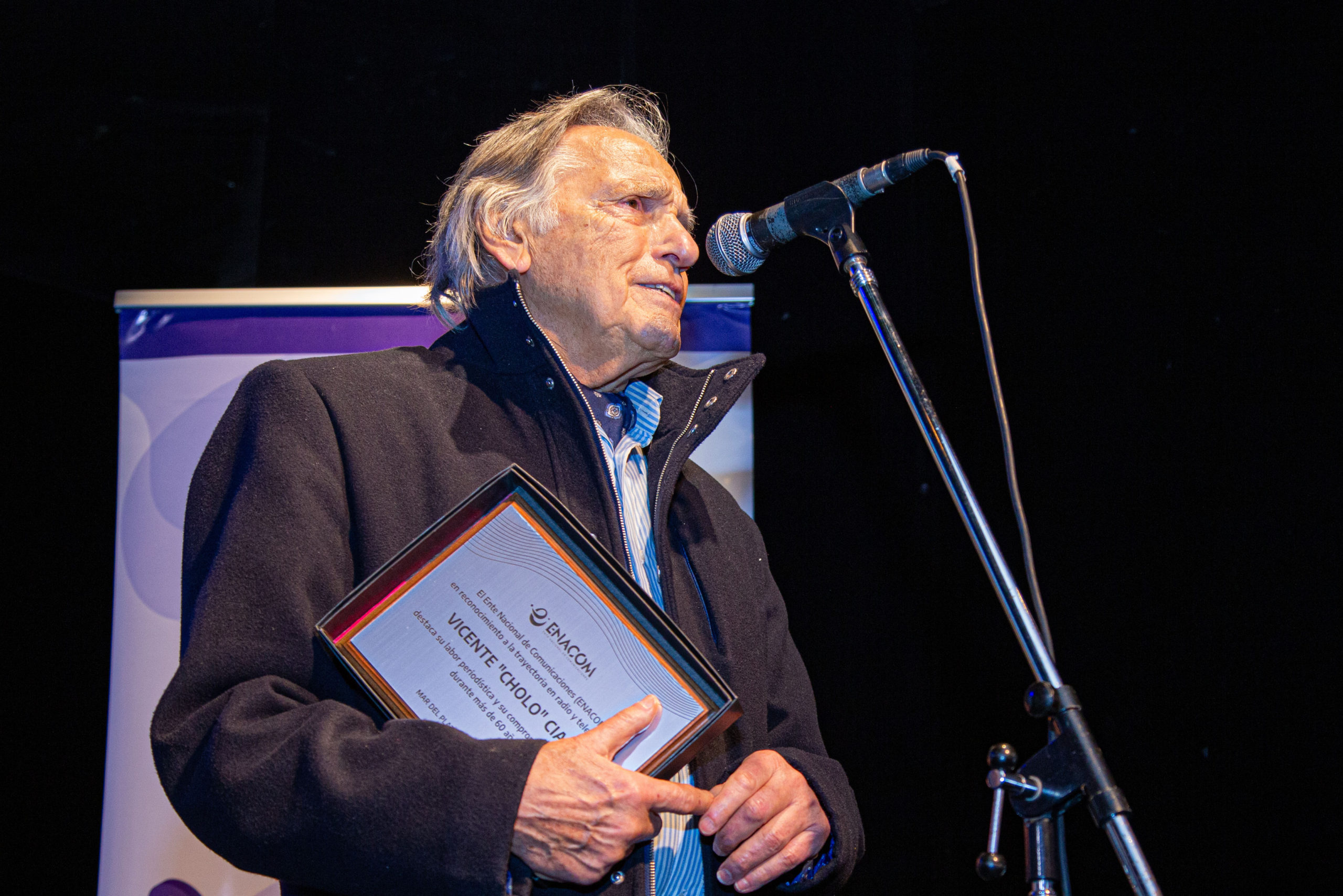 Un centenar de personas se dieron cita para el reconocimiento al periodista Vicente Luis «Cholo» Ciano que le otorgó el Ente Nacional de Comunicaciones (ENACOM) con motivo de sus más de 60 años de trayectoria en los medios de Mar del Plata. Acompañado por su hijo Ariel Ciano además de amigos y un importante número de colegas, Cholo Ciano aseguró estar viviendo una jornada signada por la emoción.