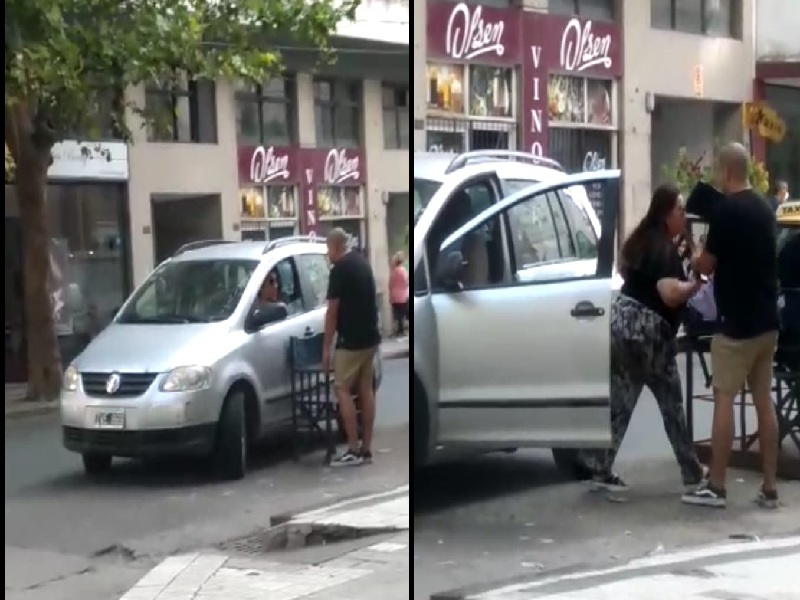Esta mañana en Brown y Tucumán, una mujer que necesitaba estacionar discutió con un hombre, trabajador o dueño de un espacio gastronómico, que no quería correr una silla.