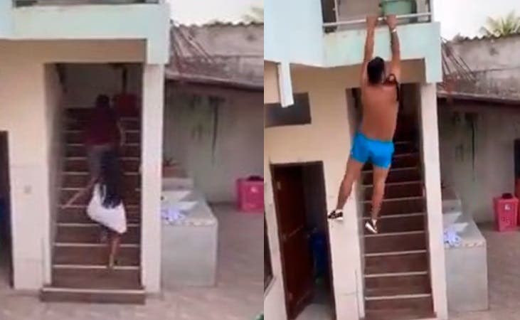 En medio del drama, se puede ver al amante en calzoncillos intentando esconderse en el segundo piso de la vivienda. El amante desesperado decidió colgarse de la baranda del balcón y cuando parecía que todo había terminado, los dos hombres se vieron y empezó la «persecución».