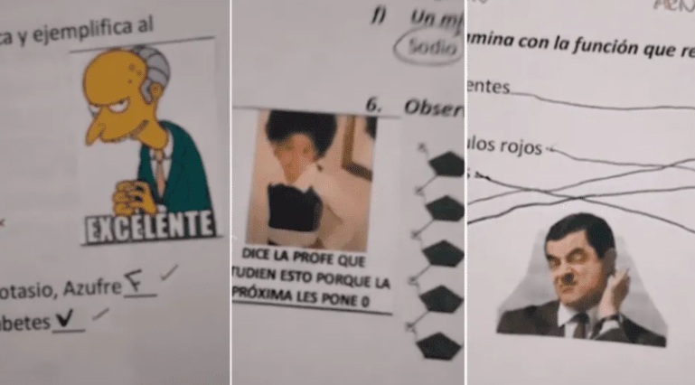 En una de sus correcciones se lee: «Dice la profe que estudien esto porque la próxima les pone cero». En tanto que en otro se ve al Señor Burns, de Los Simpson, con la palabra «excelente». Entre los memes también aparecen populares personajes como Mr. Bean y el ratón Jerry y otros de menos fama televisiva pero en auge y de uso común en las redes sociales, como el caso de los carpinchos de Nordelta.