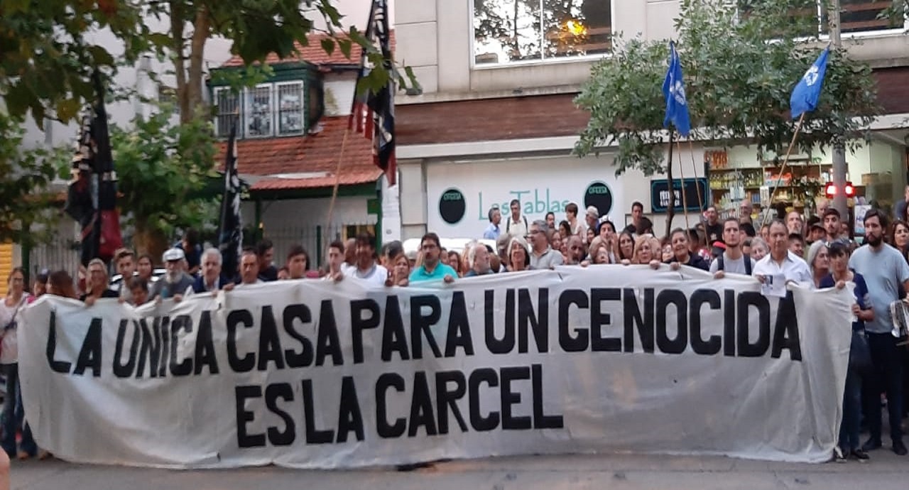 Con una gran bandera que “La casa para un genocida es la cárcel”, medio centenar de personas leyeron un comunicado y expresaron su rechazo a la decisión de los jueces Victor Bianco, Luis Imas y Alfredo Ruiz Paz.